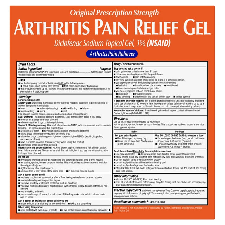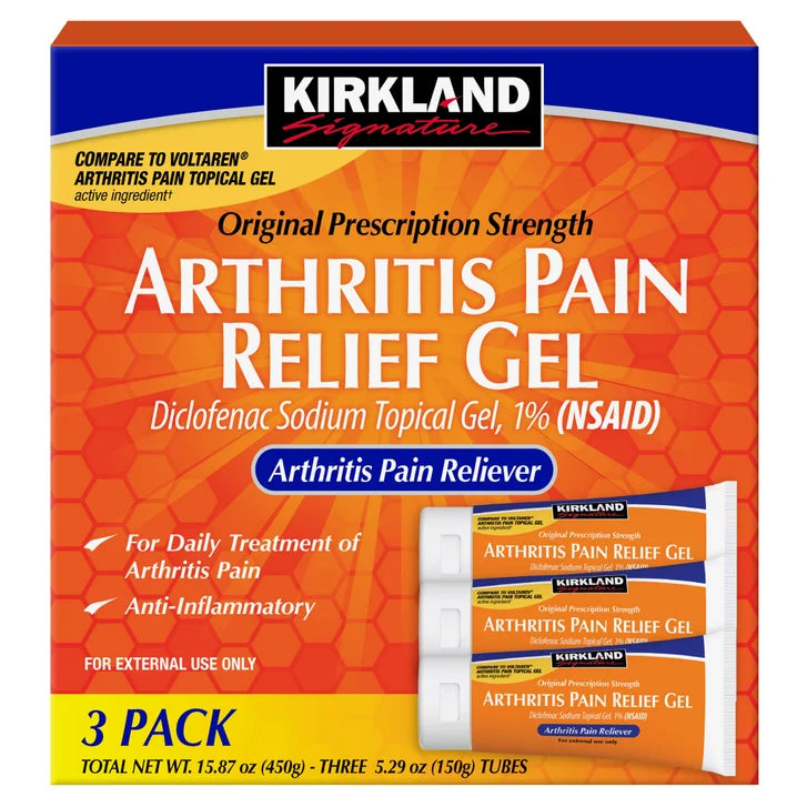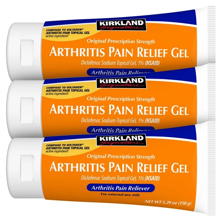 Kirkland Signature Arthritis Pain Relief Gel contains 1% Diclofenac Sodium, a topical NSAID designed to temporarily relieve arthritis-related joint pain and inflammation.
